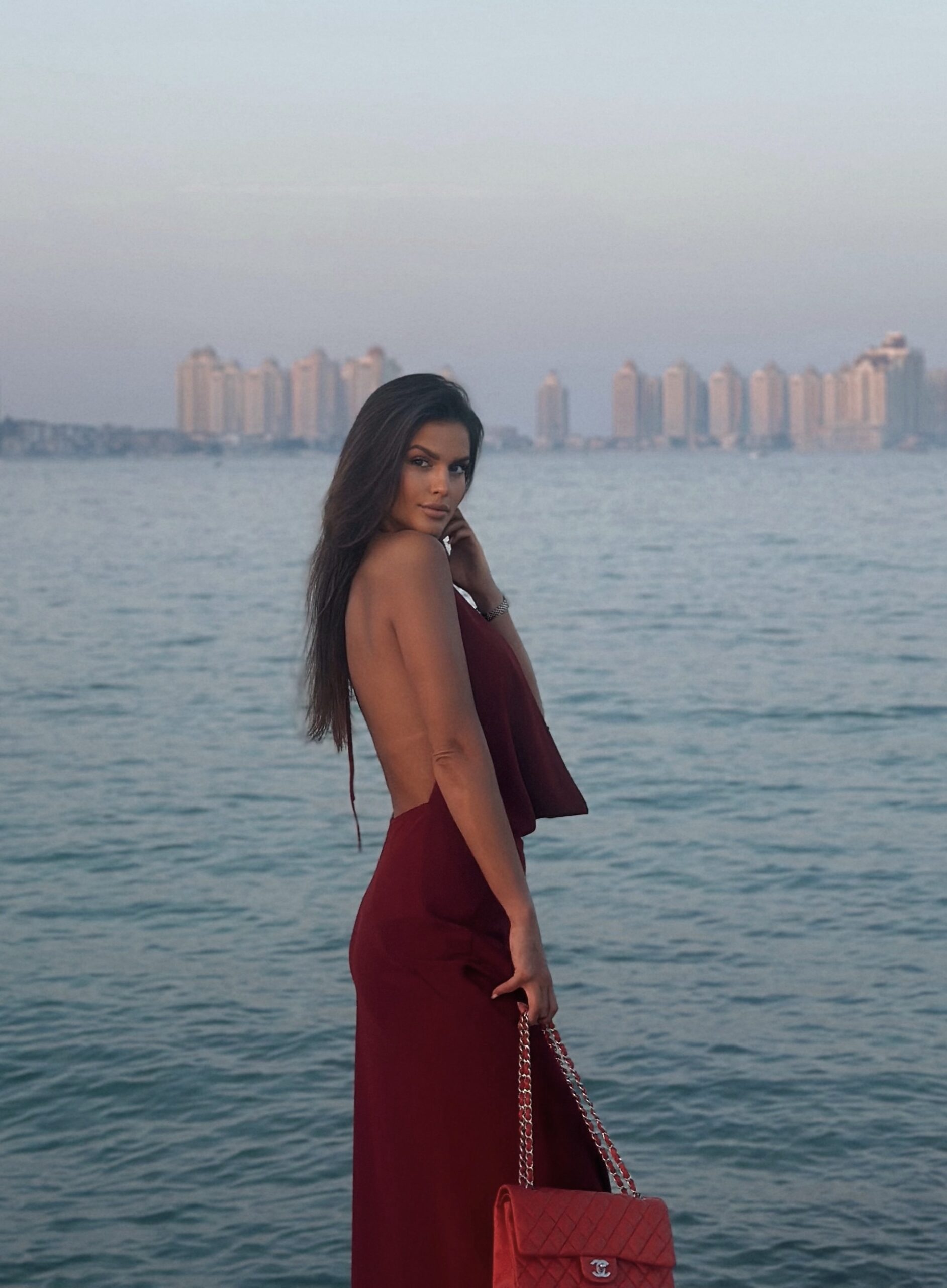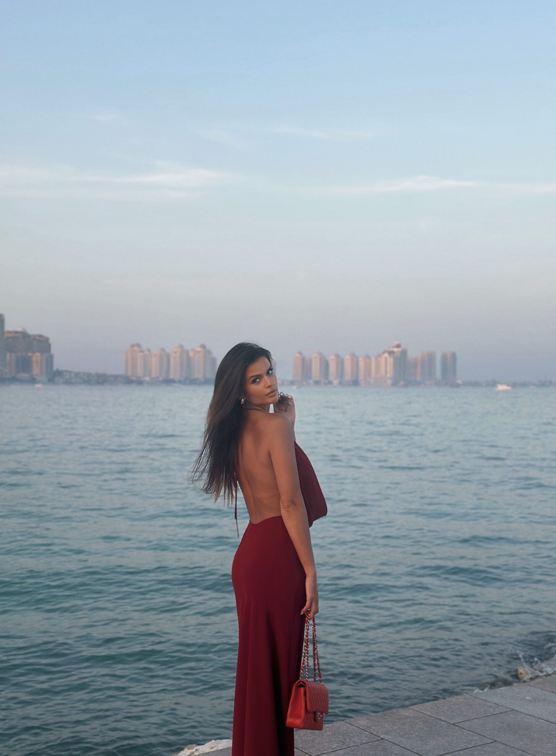 Bordowa sukienka maxi z głębokim dekoltem i odsłoniętymi plecami.